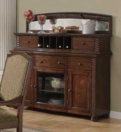 The traditional styling of this sophisticated dining set is sure to make a bold statement in your dining room The table features a cherry finish over select hardwoods and cherry veneers a decorative top and tapered legs An 18 leaf can also be added to the table extending the length to 84 and a