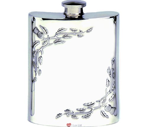 6oz Pewter Hip Flask Raised 3D Thistle on Top and Bottom Features Ideal for those cold days to share and enjoy a whisky nip Made in the UK from lead-free pewter World renowned pewter manufacturer Leak-proof screw top with optional captive top Comes in gift box This beautiful Hip Flask in